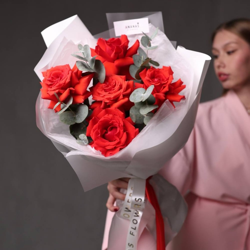 Монобукет из французских роз сорта Nina и эвкалипта в стильной упаковке