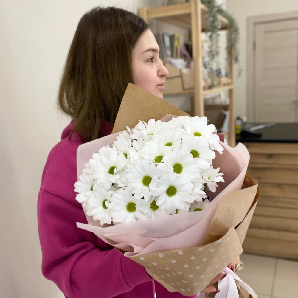 Букет до 1500 рублей из ромашковидной кустовой хризантемы в оформлении. Очень стойкий цветок