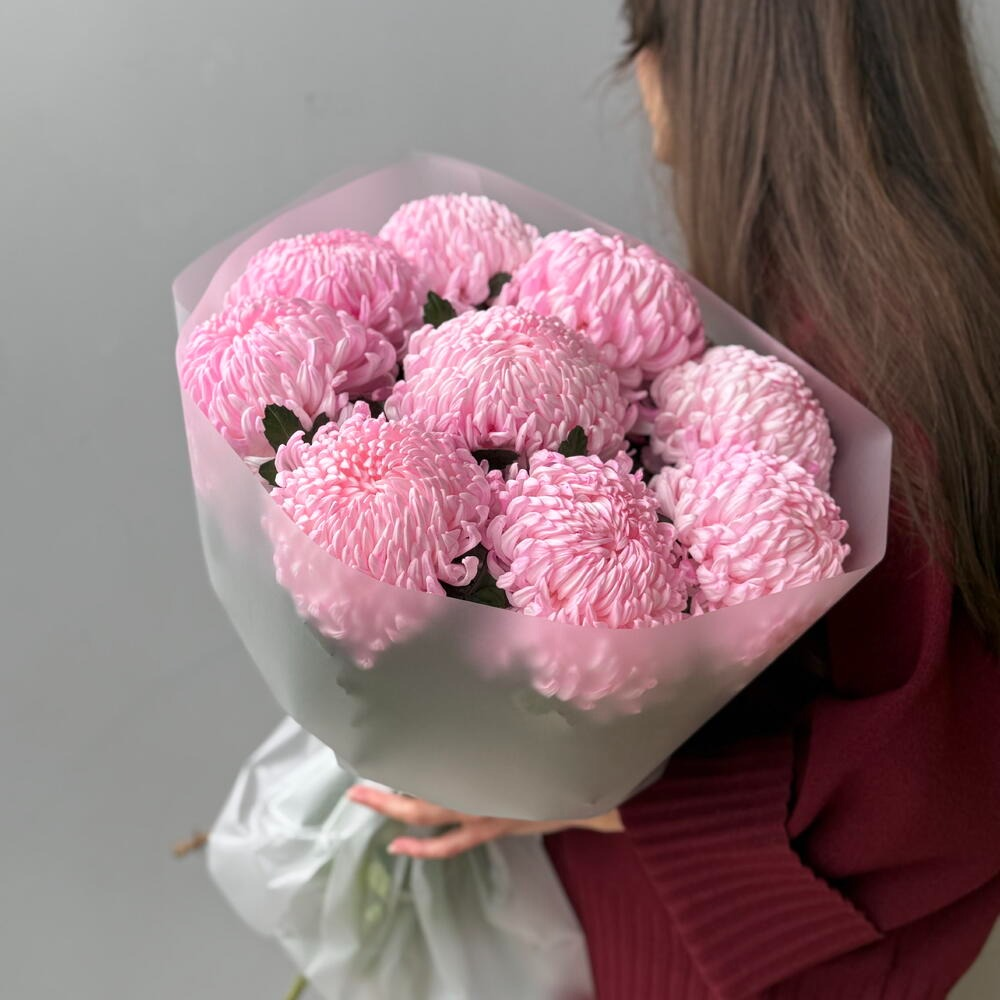 Роскошные розовые хризантемы в матовой упаковке. В дополнении к нашим букетам идет Сладкий подарок от магазина