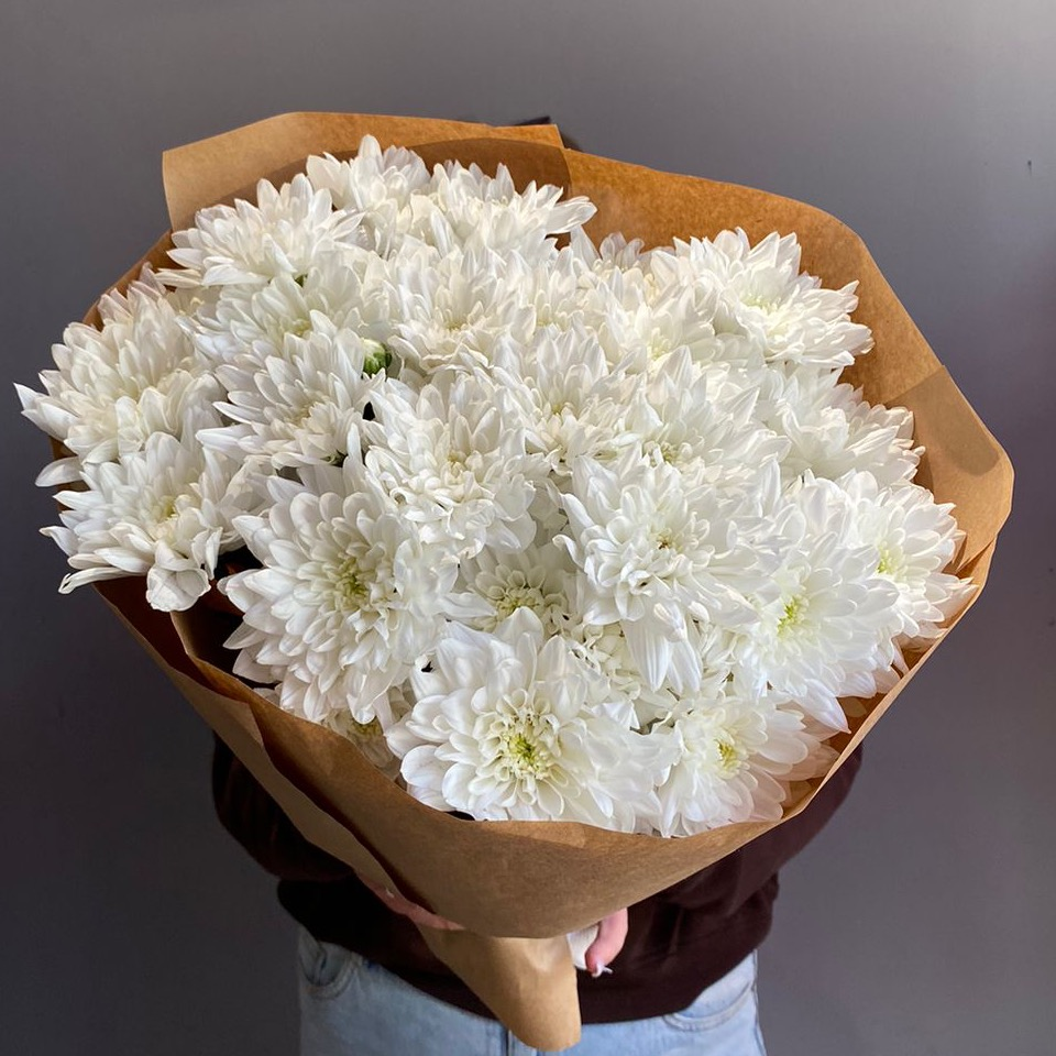 Букет из белой кустовой хризантемы в крафтовой упаковке