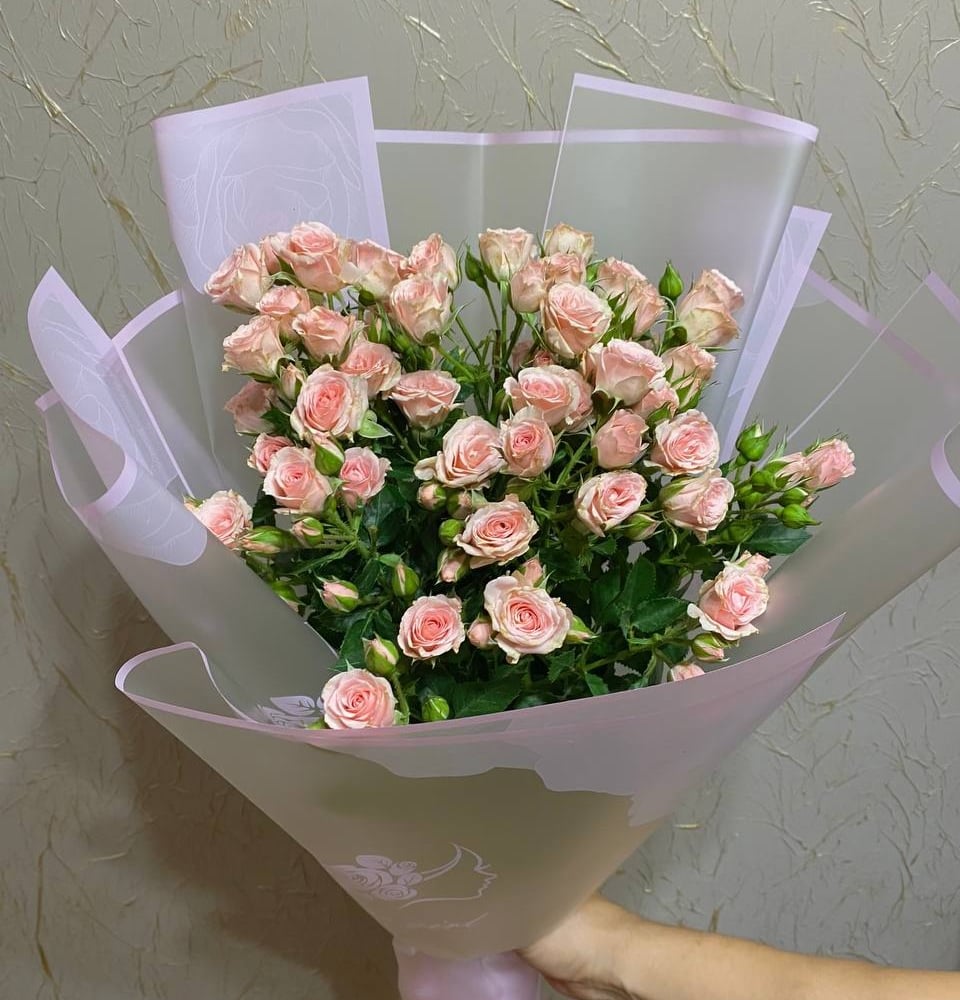 Розы кустовые нежно-розовые в стильной упаковке.