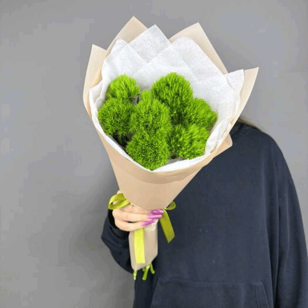 Монобукет из зелёных диантусов в классической упаковке из гвоздик