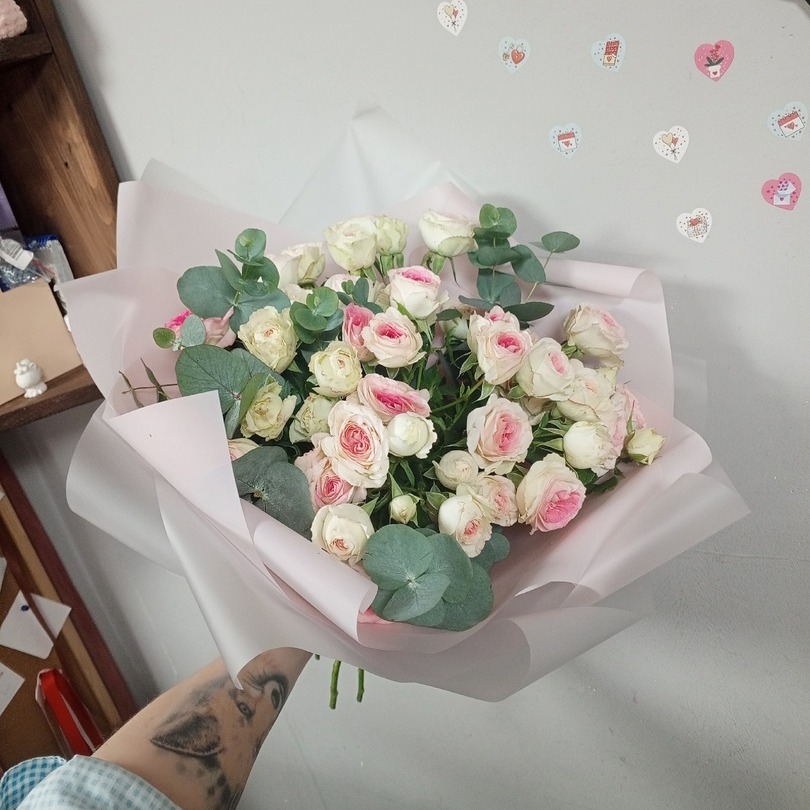 кустовые пионовидные розы-7шт эвкалипт -5шт упаковка -2шт