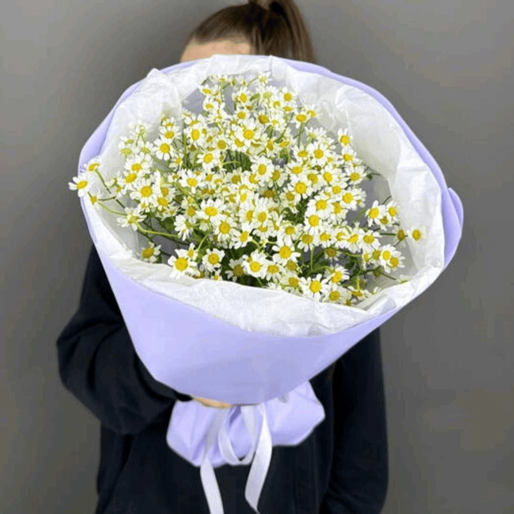 Монобукет ромашек в лавандой упаковке