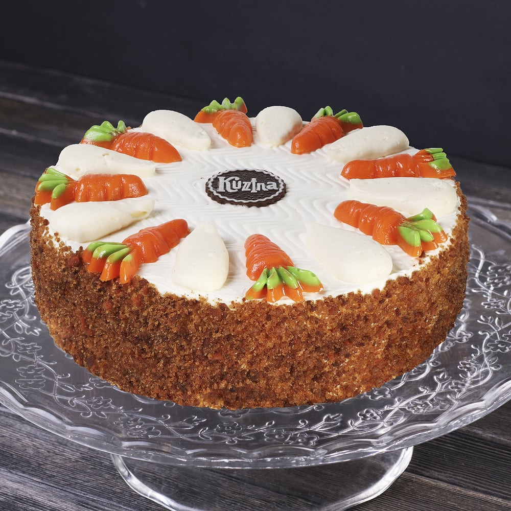 Масляный бисквит с добавлением моркови, изюма, грецкого ореха и корицы, пропитанный сырным кремом Чиз на основе творожного сыра и натуральных сливок