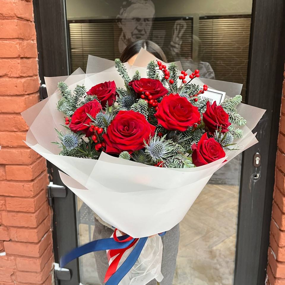 Букет из красных роз, илекса, эрингиума и нобилиса в стильной упаковке