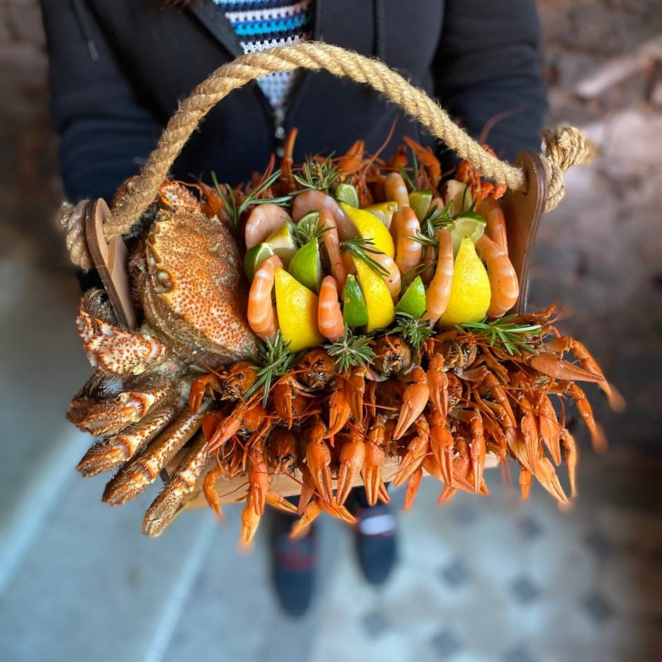Букет из раков, креветок и краба в стильном деревянном ящике "Морской бастион"