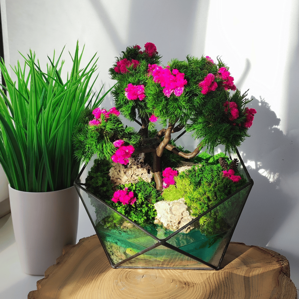 Моссариум выполнен из стабилизированных растений и мхов,не нуждается в уходе и поливе. Не вянет и не портится в течение 5 лет. Водоем светиться в темноте