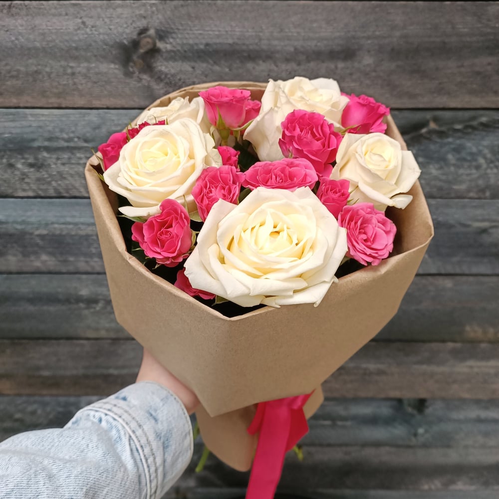 Милый букет с белыми розами и розовой кустовой розочкой.