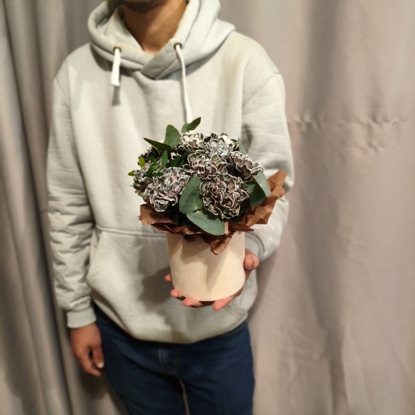 мраморные диантусы с эвкалиптом в бархатной коробке