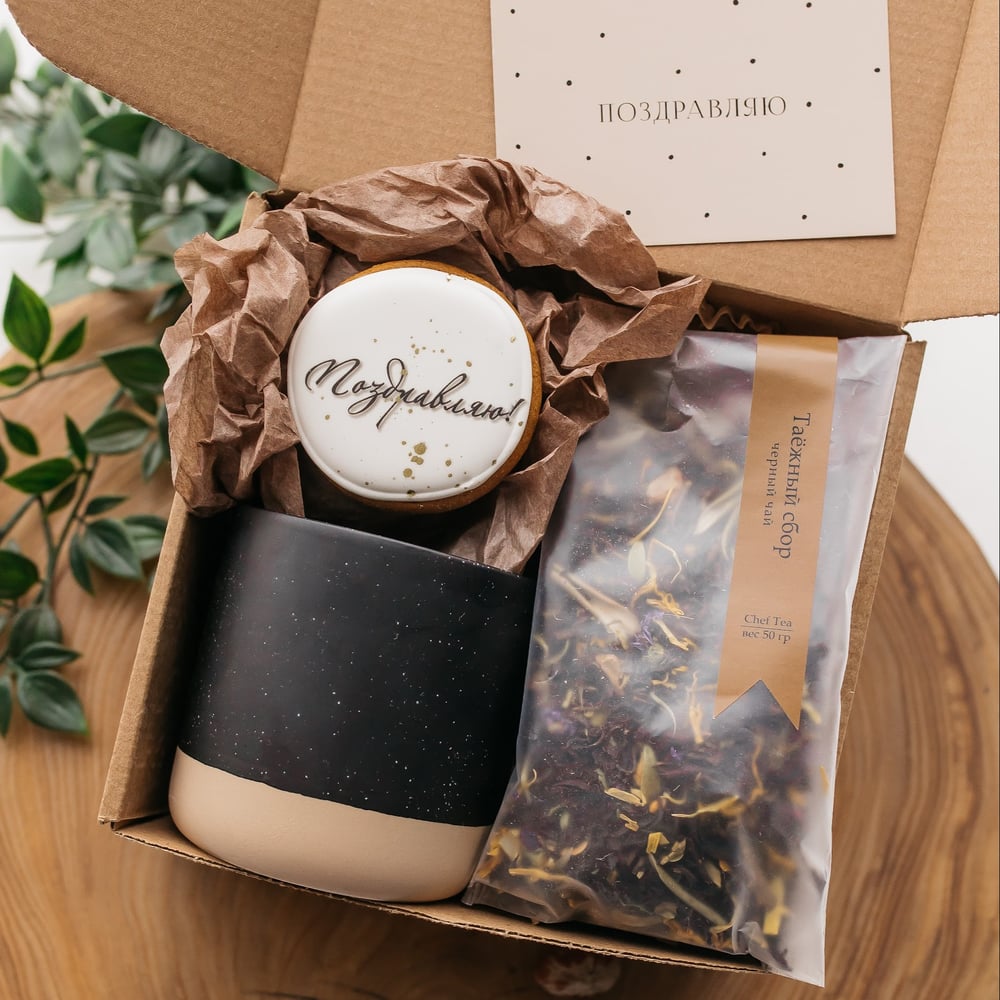 Что внутри? - кружка 400 мл; - чай "Таежный сбор"; - пряник ручной работы; - открытка Набор оформлен в крафтовой коробочке 16*16 с атласной лентой. Подарочный пакет в комплекте!