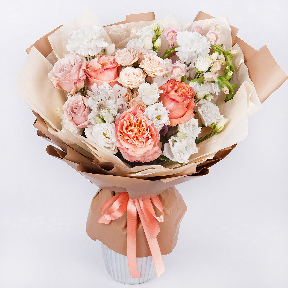 Букет «Музыка души» — это гармоничное сочетание кремовых и кустовых роз, гвоздик, маттиол, альстромерий, лизиантусов и пионовидных роз, которое подарит получателю ощущение нежности и гармонии. Бук...