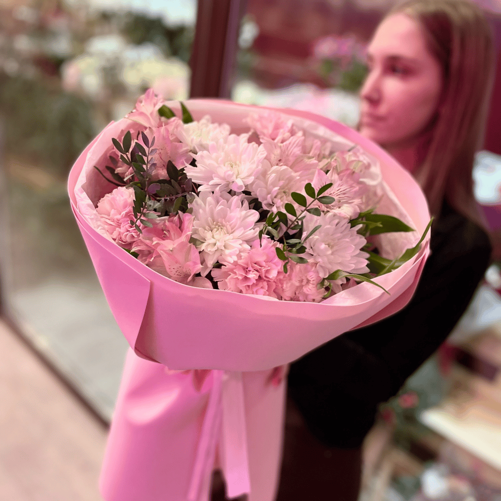 Кругляш из хризантемы, альстромерии, диантуса и фисташки