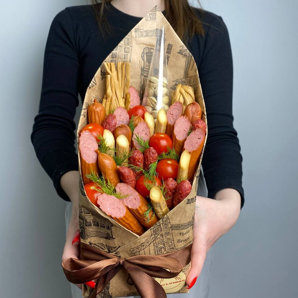 Выбор подарка для мужчины — всегда вызов. Мы упростили задачу и собрали всё, что он по-настоящему любит, в один стильный «Мясной конверт». Почему это лучший выбор? Вау-эффект: Необычная подача в виде конверта выглядит оригинальнее обычного букета. Универсальность: Подходит под любой напиток и любой повод — от Дня рождения до просмотра футбольного матча. Качество 10/10: Мы используем три вида колбасок и свежайший копченый сыр, фисташки, сочные помидоры черри и ароматные сырные палочки . Никакой «пластиковой» еды — только то, что купили бы себе. Закажите прямо сейчас и станьте автором самого оригинального подарка на празднике!