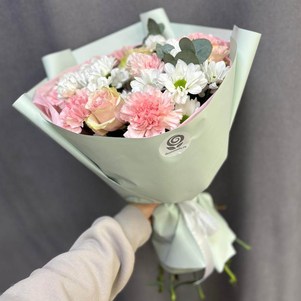 Букет "Мятный рай" составленный из роз эквадора, диантуса, кустовой хризантемы, эвкалипт в нежно-мятной упаковке