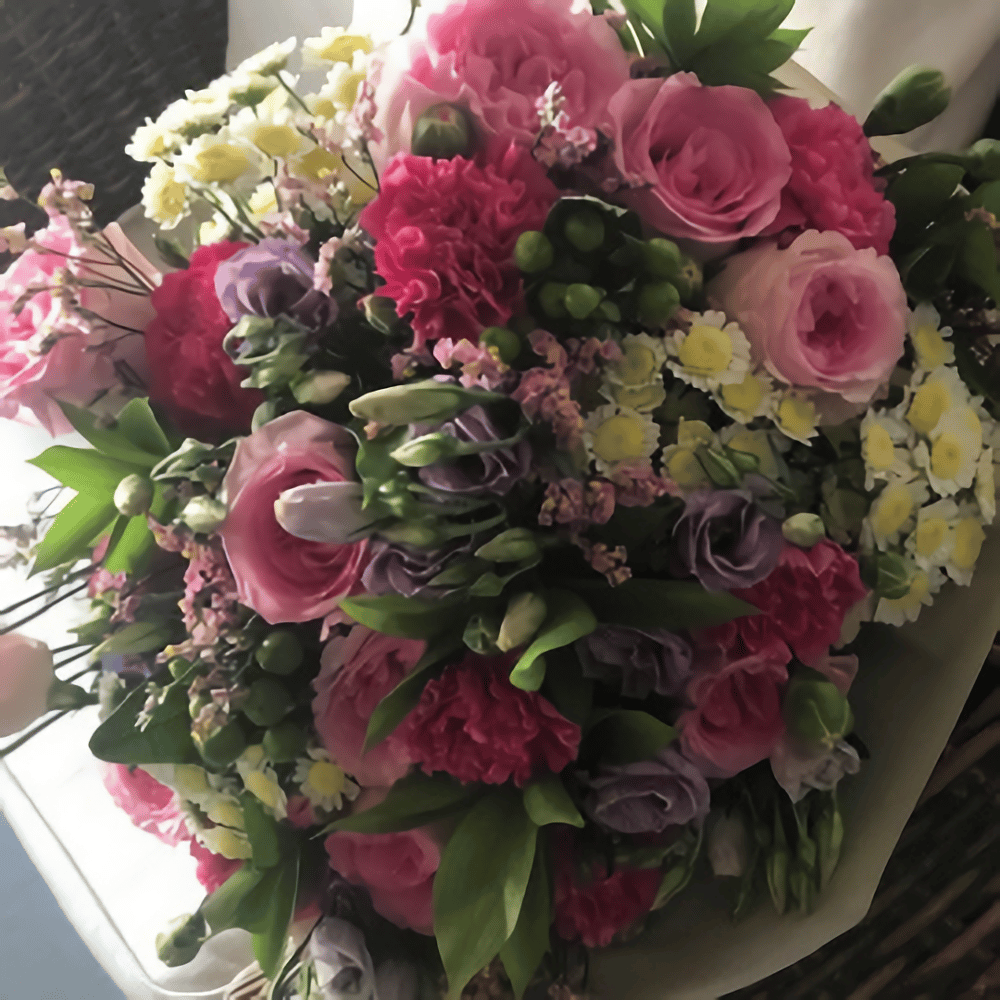 С этим букетом вы сможете передать самые искренние чувства. Розы и лизиантус в сочетании с гиперикумом и статицей, оформленные в современную упаковку, создадут атмосферу нежности и заботы, а стильная лента станет завершающим штрихом.