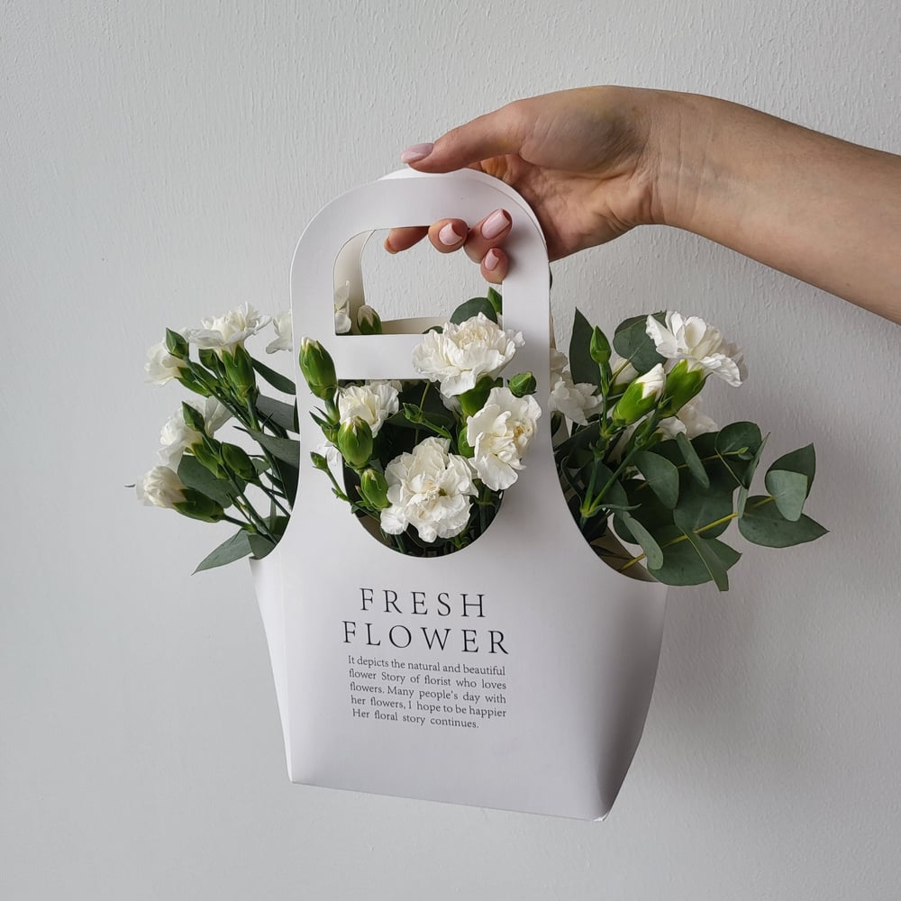 Коробка с цветами «На стиле» из гвоздик и гипсофил