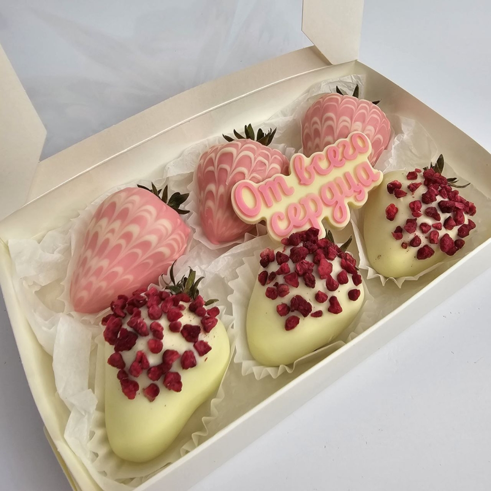 6 клубник в белом бельгийском шоколаде, Шоколадная табличка из бельгийского белого шоколада, Сублимированная малина, Подарочная упаковка, Бант из атласной ленты, Атласная лента