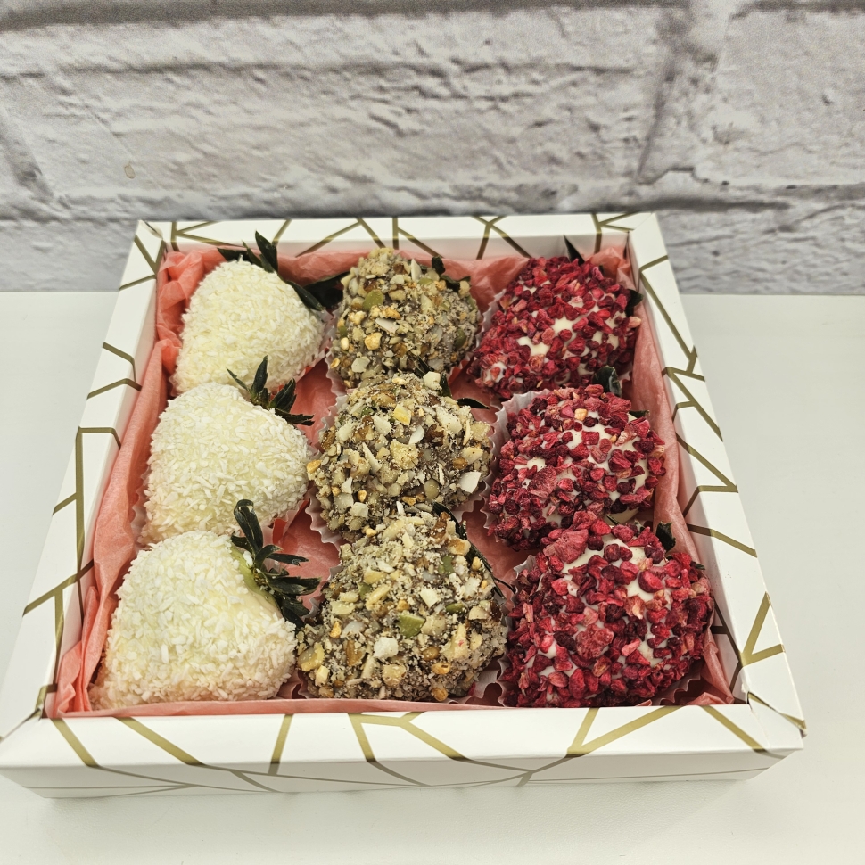 6 клубник в бельгийском белом шоколаде, 3 клубники в бельгийском молочном шоколаде, Кокосовая стружка, Сублимированная малина, Ореховая посыпка из дробленных орехов (Фисташки, Грецкий орех, Миндаль...