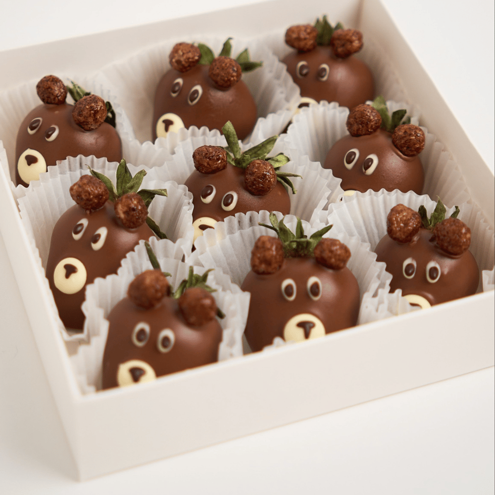 "Набор «Барни» — милый и вкусный десерт для детей 🧸🍓 Свежая клубника покрыта молочным бельгийским шоколадом, а каждая ягодка украшена очаровательным дизайном в виде мордочки мишки. Такой наб…