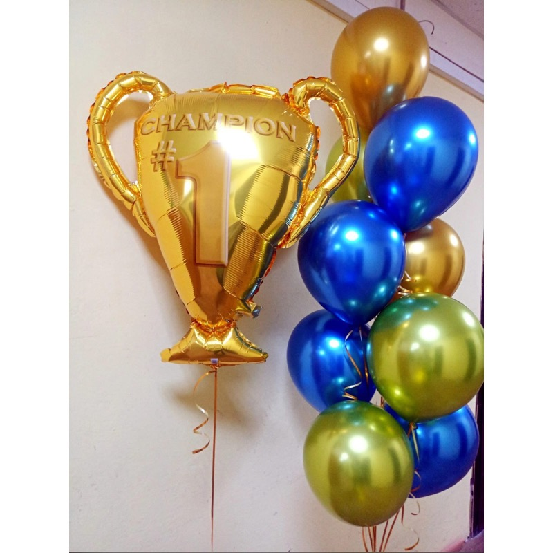 Набор "Чемпион" Состав: фигурный шар кубок -1 шт; шар хром золото -2 шт; шар хром зелёный -3 шт; шар хром синий- 4 шт , с обработкой длительного полёта и гелием