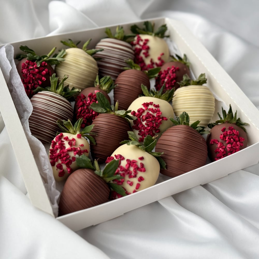 Клубника в молочном и белом бельгийском шоколаде, украшенной сублимированной малиной и фирменными узорами