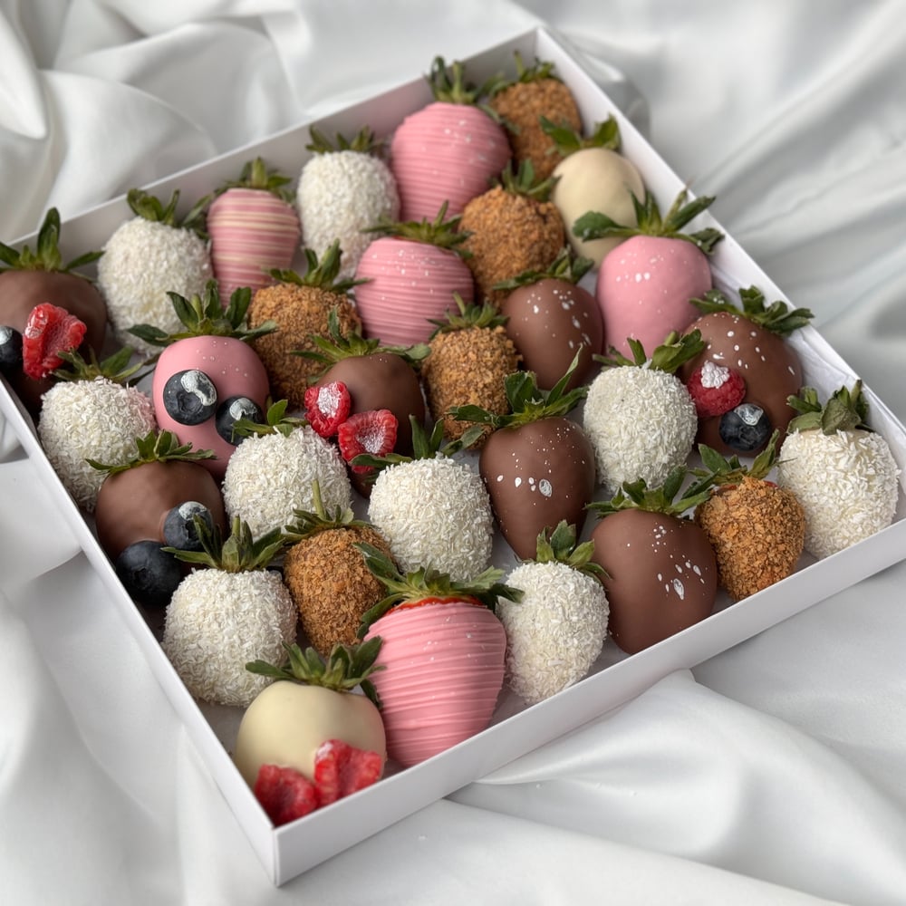 в наборе 30 разнообразных, вкусных, красивых, сделанных вручную ягод, но есть то, что их объединяет! Вкусный настоящий бельгийский шоколад и сочная свежая клубника! Идеален для: подруги, мамы, коллеги на работе, в знак благодарности или для первого свидания!