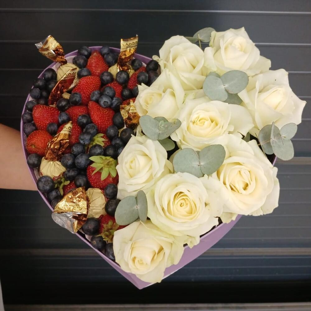 Доставка цветов и подарков в Симферополе! Съедобная композиция с черникой, клубникой и шоколадными конфетами. Украшена белыми крымскими розочками на биофлоре.