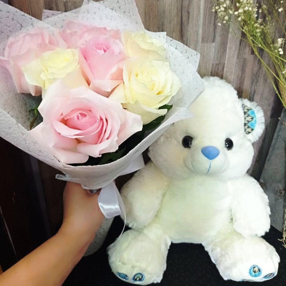 Мягкая игрушка "Мишка 25см" + букет из белых и розовых роз (7шт)