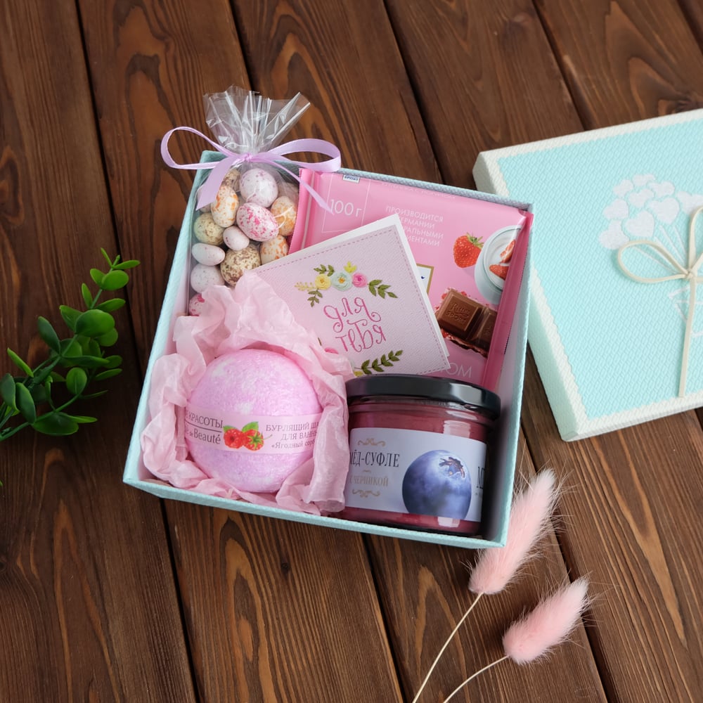 В наборе: 📌Коробка 15,5*15,5*6,5 см 📌Бурлящий шарик для ванны 📌Мёд-суфле 120 гр (вкусы разные) 📌Арахис в шоколаде и разноцветной глазури 📌Шоколад Ritter Sport
