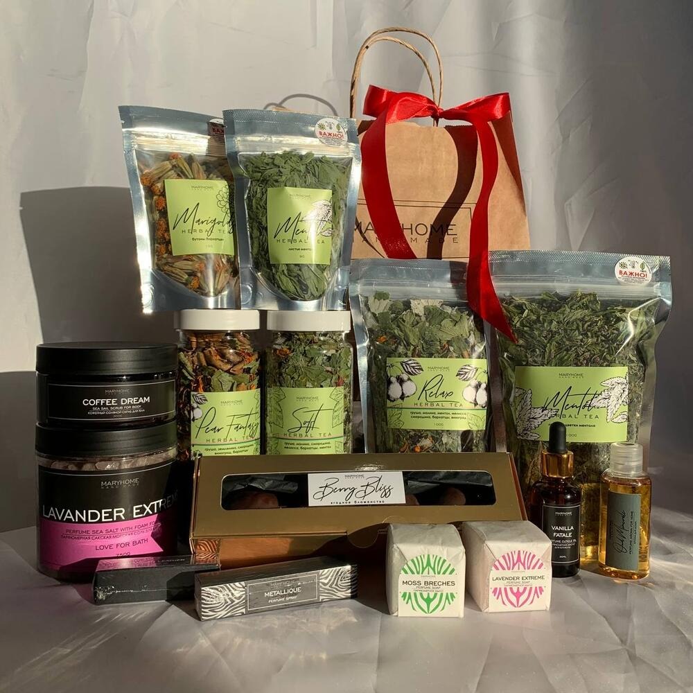 Подарите себе или близкому мгновение чистого наслаждения для всех чувств! Этот набор — настоящая симфония вкуса, аромата и тактильного удовольствия: · Отборный чай урожая 2025 года перенесёт вас в солнечный осенний сад. · Конфеты ручной работы вернут вкус сочного лета. · Нежная парфюмированная косметика для тела окутает шлейфом изысканного аромата, завершая образ совершенства. Идеальный десерт для уютного вечера, роскошный ритуал ухода и изысканный подарок для тех, кто ценит совершенство в деталях. С любовью к каждой детали. Описание набора: 1. Кофейный скраб для тела Coffee Dream”, 300g 2. Парфюмерная морская соль для ванн с пеной, 750g 3. Духи, 5ml 4. Парфюмерная вода, 10ml 5. Парфюмерное мыло, 70g - 2шт 6. Чай из бутонов бархатцев“Marigolds”, 15g 7. Фруктово-травяной чай Pear Fantasy, 120g 8. Травяной чай Soft, 80g 9. Ментоловая мята “Mentol” Herbal tea, 9г 10. Фруктово-травяной чай Relax Herbal Tea, 100g 11. Ментоловая мята с цветками “Mentol”, 100g 12. Набор конфет ручной работы, 4шт, 190g 13. Арома для дома, 50g 14. Парфюмерное масло для кутикулы, 30ml 15. Подарочный пакет с красной лентой. Закажите свой набор красоты и откройте мир качественных продуктов от MARYHOME.