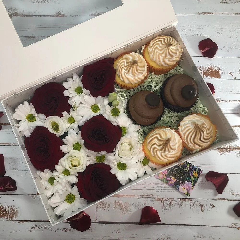 Набор в дизайнерской коробке с розами, хризантемами, эустомами и невероятными капкейками. Подарок, который удивит и порадует любого :) В составе: Хризантемы (головки) - 11 шт. Розы - 5 шт. Эустомы - 5 шт. Капкейки - 6 шт.