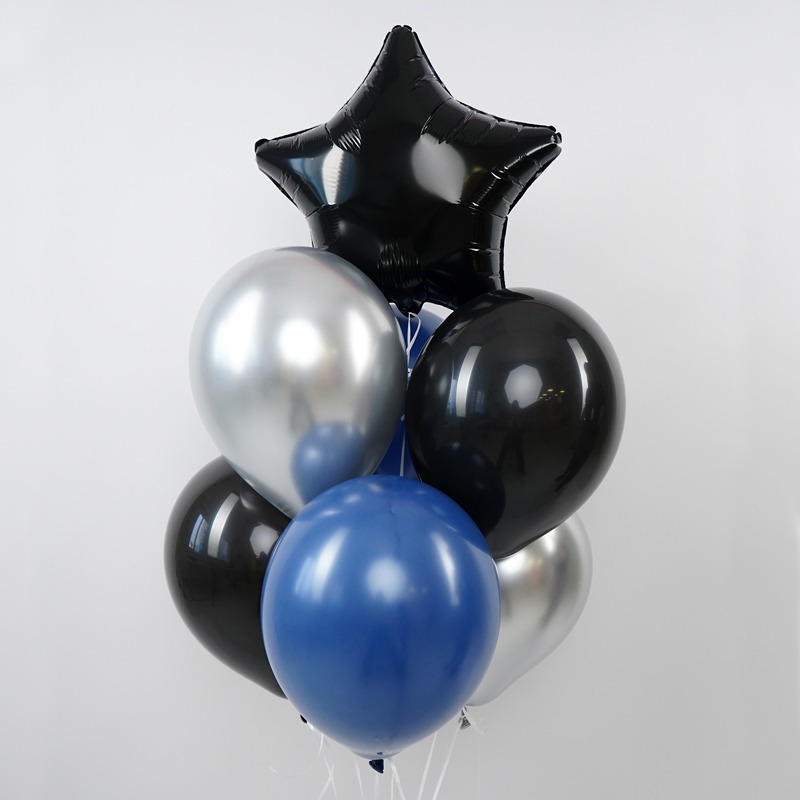 Набор воздушных шаров Ночное сияние отлично подойдет для оформления и подарка ко Дню рождения, или в качестве поздравления с любым другим праздником или событием, а также вовсе без повода. Стильное сочетание темных и стальных оттенков сделает декор вашего праздника незабываемым. Набор состоит: -фольгированная звезда 1шт 46см -латексный шар 6шт 30см -грузик 1шт -транспортировочный пакет 1 шт