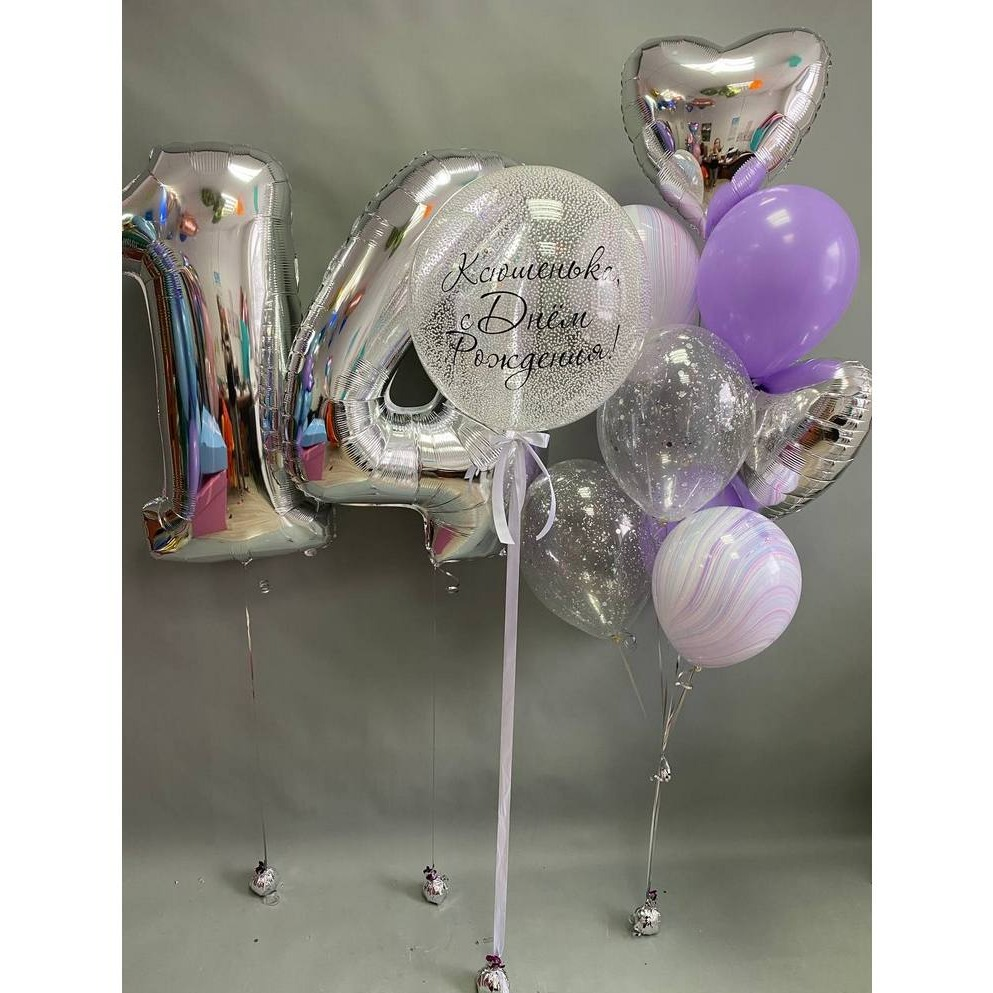 Грузик - 4 шт; Обработка всех шаров для долго полета - 1 шт; Гелий Фольга цифра - 2 шт; Гелий Фольга средняя - 2 шт; Гелий Шарик Латекс 12 д. - 5 шт; Гелий Шарик Латекс с наполнителем - 2 шт; Шар баблс с надписью и наполнением гелий - 1 шт; В наборе можно откорректировать все по Вашему усмотрению только при условии наличия цветов в магазине!