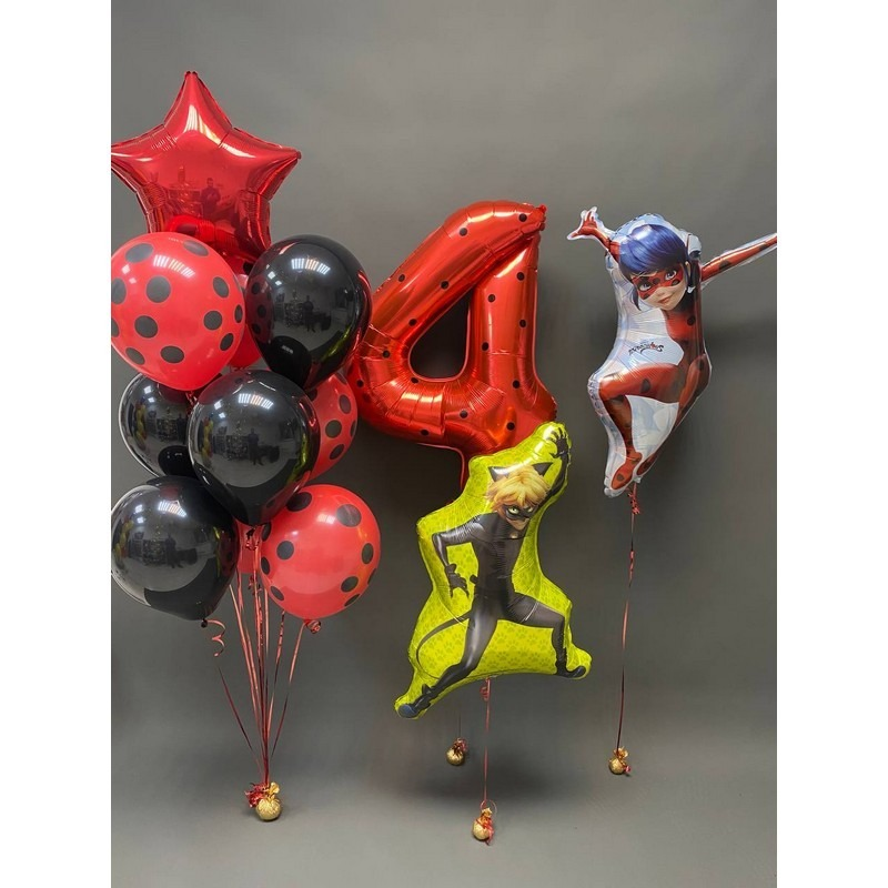 Грузик - 4 шт; Обработка всех шаров для долго полета - 1 шт; Гелий Фольга огромная (фигура) - 2 шт; Гелий Фольга цифра - 1 шт; Гелий Фольга средняя - 1 шт; Гелий Шарик Латекс 12 д. - 6 шт; Гелий Шарик Латекс с рисунком - 3 шт; В наборе можно откорректировать все по Вашему усмотрению только при условии наличия цветов в магазине!