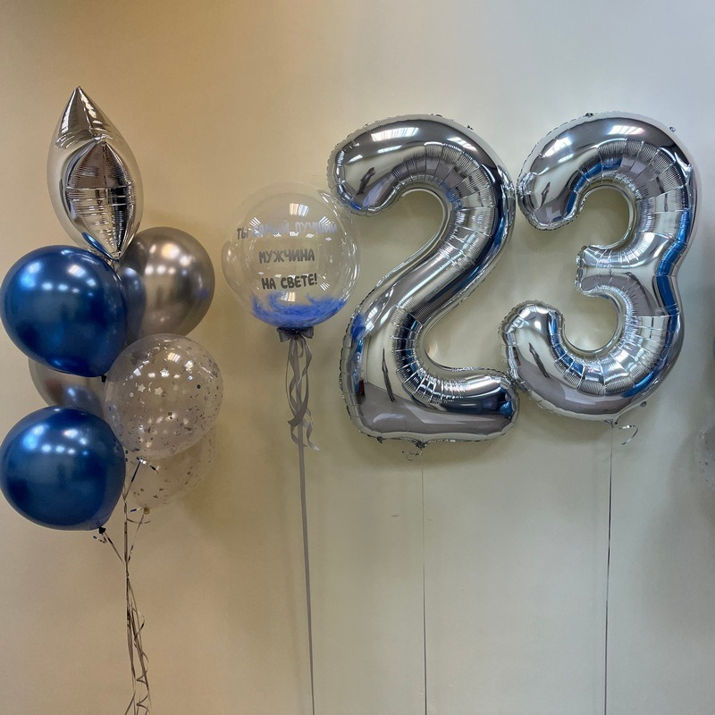 Грузик - 4 шт; Обработка всех шаров для долго полета - 1 шт; Гелий Фольга цифра - 2 шт; Гелий Фольга средняя - 1 шт; Гелий Шарик Латекс 12 д. - 4 шт; Гелий Шарик Латекс с наполнителем - 2 шт; Шар баблс с надписью и наполнением гелий - 1 шт; В наборе можно откорректировать все по Вашему усмотрению только при условии наличия цветов в магазине!