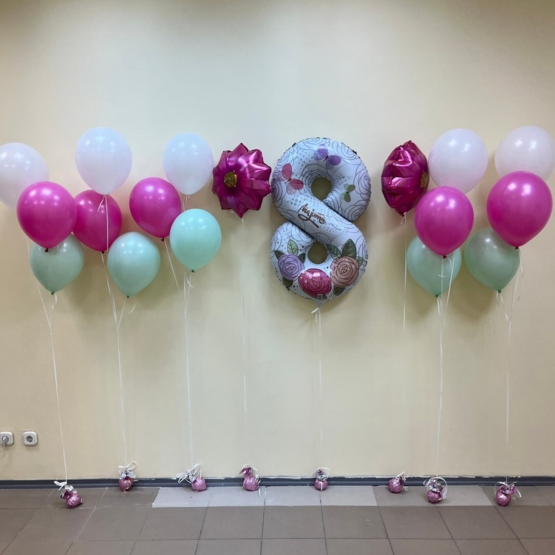 Грузик - 8 шт; Обработка всех шаров для долго полета - 1 шт; Гелий Фольга огромная (фигура) - 1 шт; Гелий Фольга с надписью - 2 шт; Гелий Шарик Латекс 12 д. - 15 шт; В наборе можно откорректировать все по Вашему усмотрению только при условии наличия цветов в магазине!