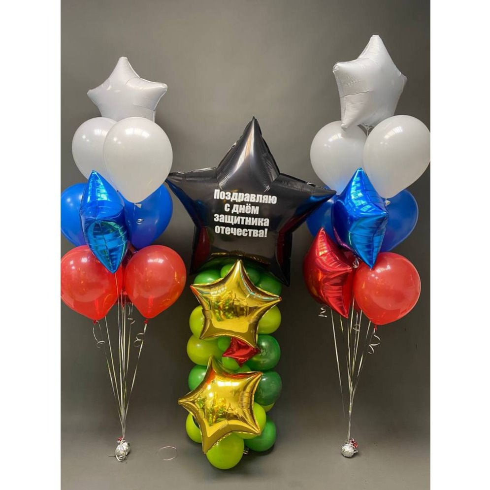Грузик - 2 шт; Обработка всех шаров для долго полета - 1 шт; Надпись на шаре - 1 шт; Гелий Фольга средняя - 6 шт; Гелий Шарик Латекс 12 д. - 12 шт; Фольга фигура воздух - 1 шт; Фольга средняя воздух - 2 шт; Фольга малая воздух - 1 шт; Латекс 12 д. однотонный воздух - 48 шт; Сборка шаров 2 сложность - 1 шт; Столбик - 1 шт; В наборе можно откорректировать все по Вашему усмотрению только при условии наличия цветов в магазине!