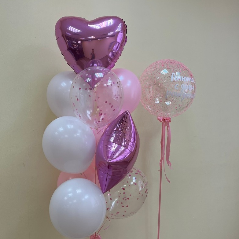 Грузик - 2 шт; Обработка всех шаров для долго полета - 1 шт; Гелий Фольга средняя - 2 шт; Гелий Шарик Латекс 12 д. - 6 шт; Гелий Шарик Латекс с наполнителем - 2 шт; Шар баблс с надписью и нап…