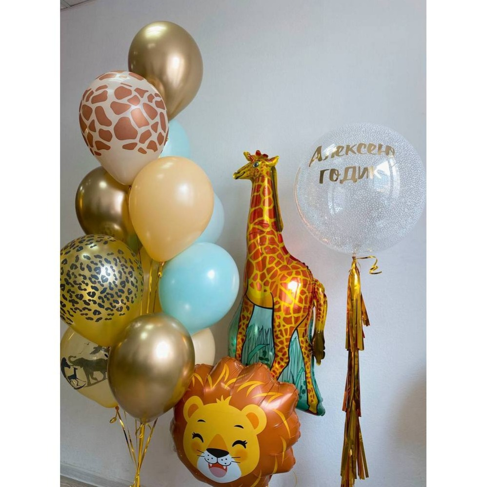 Грузик - 4 шт; Обработка всех шаров для долго полета - 1 шт; Тассел кисти для шаров - 1 шт; Гелий Фольга огромная (фигура) - 2 шт; Гелий Шарик Латекс 12 д. - 9 шт; Гелий Шарик Латекс с рисунком - 3 шт; Шар баблс с надписью и наполнением гелий - 1 шт; В наборе можно откорректировать все по Вашему усмотрению только при условии наличия цветов в магазине!