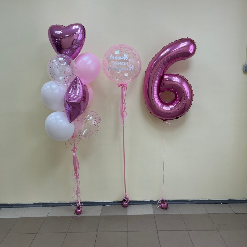 Грузик - 3 шт; Обработка всех шаров для долго полета - 1 шт; Гелий Фольга цифра - 1 шт; Гелий Фольга средняя - 2 шт; Гелий Шарик Латекс 12 д. - 6 шт; Гелий Шарик Латекс с наполнителем - 2 шт; Шар баблс с надписью и наполнением гелий - 1 шт; В наборе можно откорректировать все по Вашему усмотрению только при условии наличия цветов в магазине!