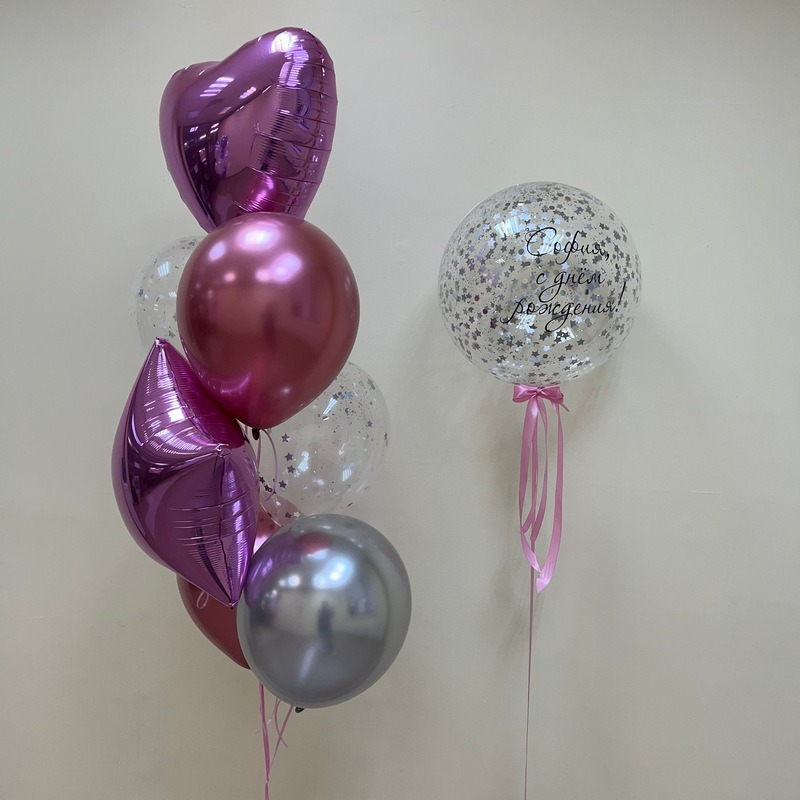 Грузик - 2 шт; Обработка всех шаров для долго полета - 1 шт; Гелий Фольга средняя - 2 шт; Гелий Шарик Латекс 12 д. - 3 шт; Гелий Шарик Латекс с наполнителем - 2 шт; Шар баблс с надписью и нап…