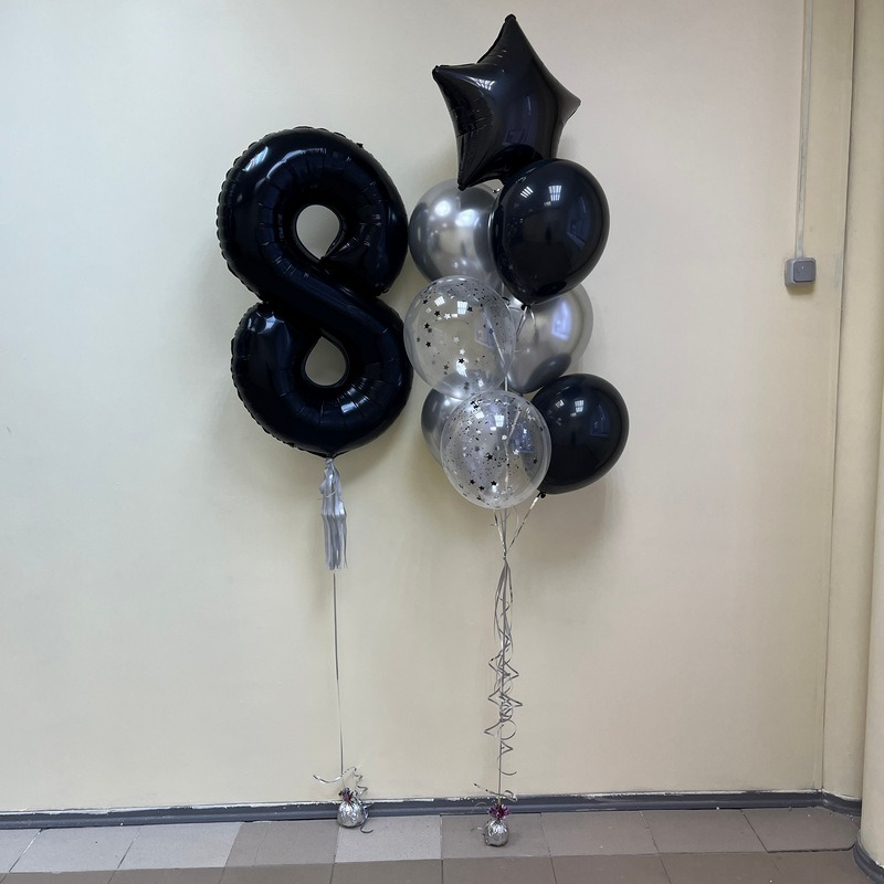 Грузик - 2 шт; Обработка всех шаров для долго полета - 1 шт; Тассел кисти для шаров (дождик) - 1 шт; Гелий Фольга цифра - 1 шт; Гелий Фольга средняя - 1 шт; Гелий Шарик Латекс 12 д. - 5 шт; Гелий Шарик Латекс с наполнителем - 2 шт; В наборе можно откорректировать все по Вашему усмотрению только при условии наличия цветов в магазине!