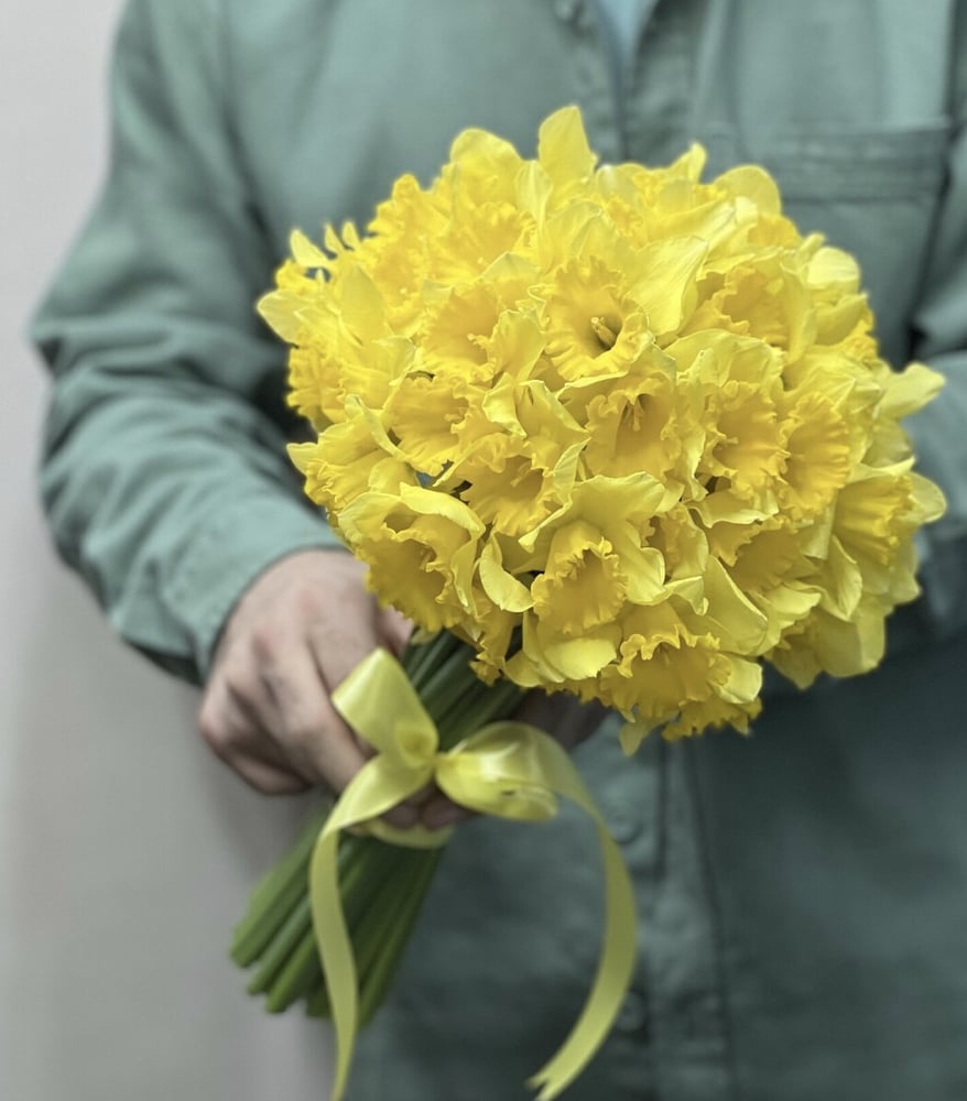 От этого стильного букета исходит небесное сияние. Для него флористы выбрали 51 свежих нарцисс с желтыми лепестками. Букет классической формы - одной из самых популярных во флористике. Стебли цветов туго стянуты широкой шелковой лентой светло-зеленого тона. Если нужно подчеркнуть хрупкость и изящество женщины – лучшей композиции вам не найти. Желтые нарциссы — это символ чистоты и юности. Эти цветы станут стильным аксессуаром, дополняющим облик новобрачной. Они порадуют девушку в день рождения или в годовщину встречи, прекрасно подойдут для выпускного бала.