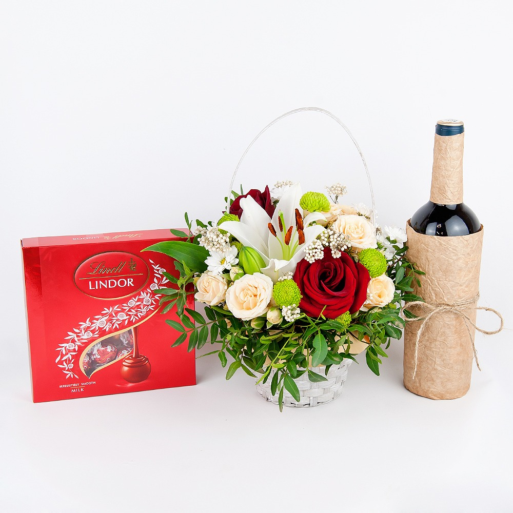 Отличный подарочный набор для самых дорогих вашему сердцу людей. Роскошная корзина со свежими розами, лилиями и хризантемами, бутылка хорошего вина и коробка шоколадных конфет обязательно понравятся…