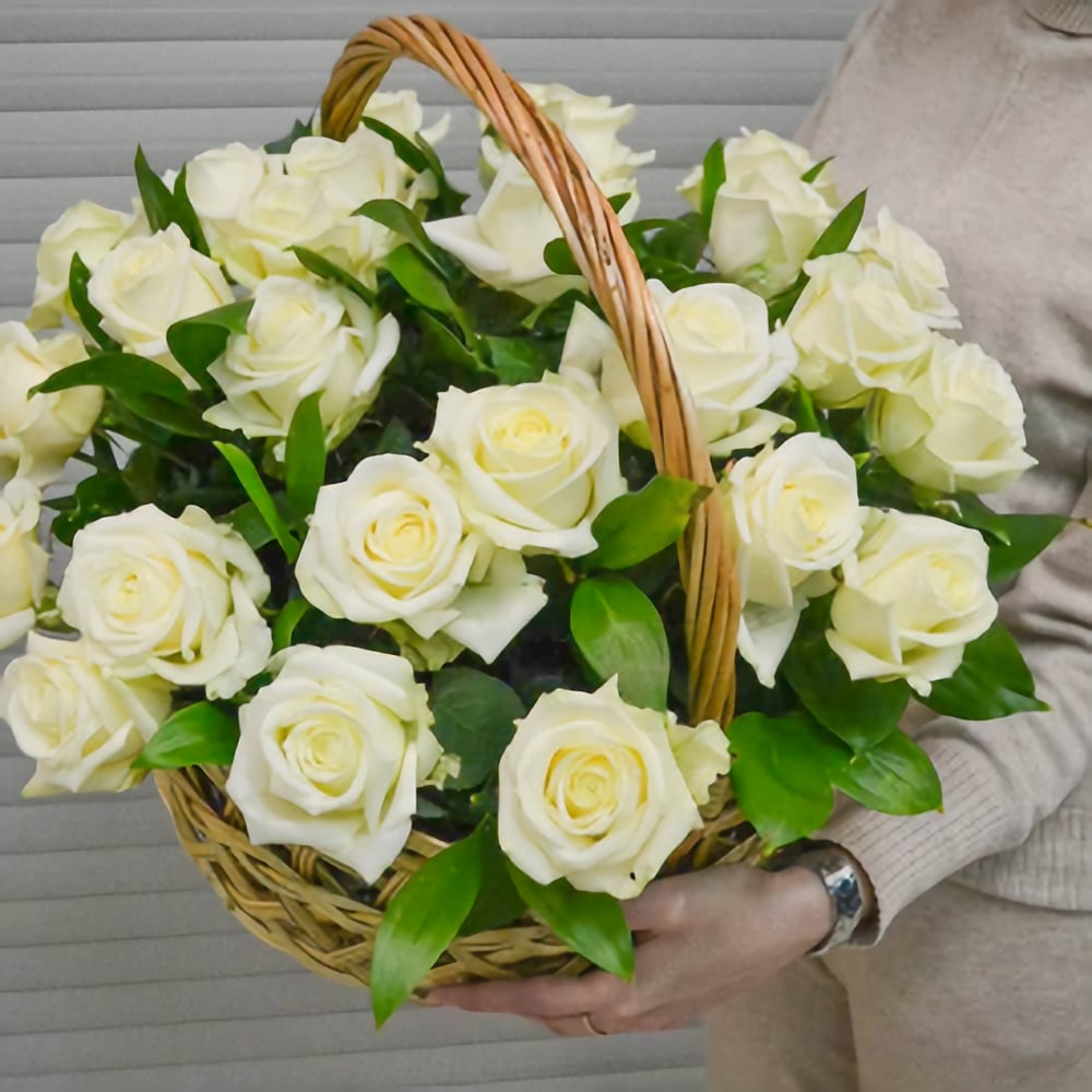 Корзина с цветами «Небесно белый» из роз