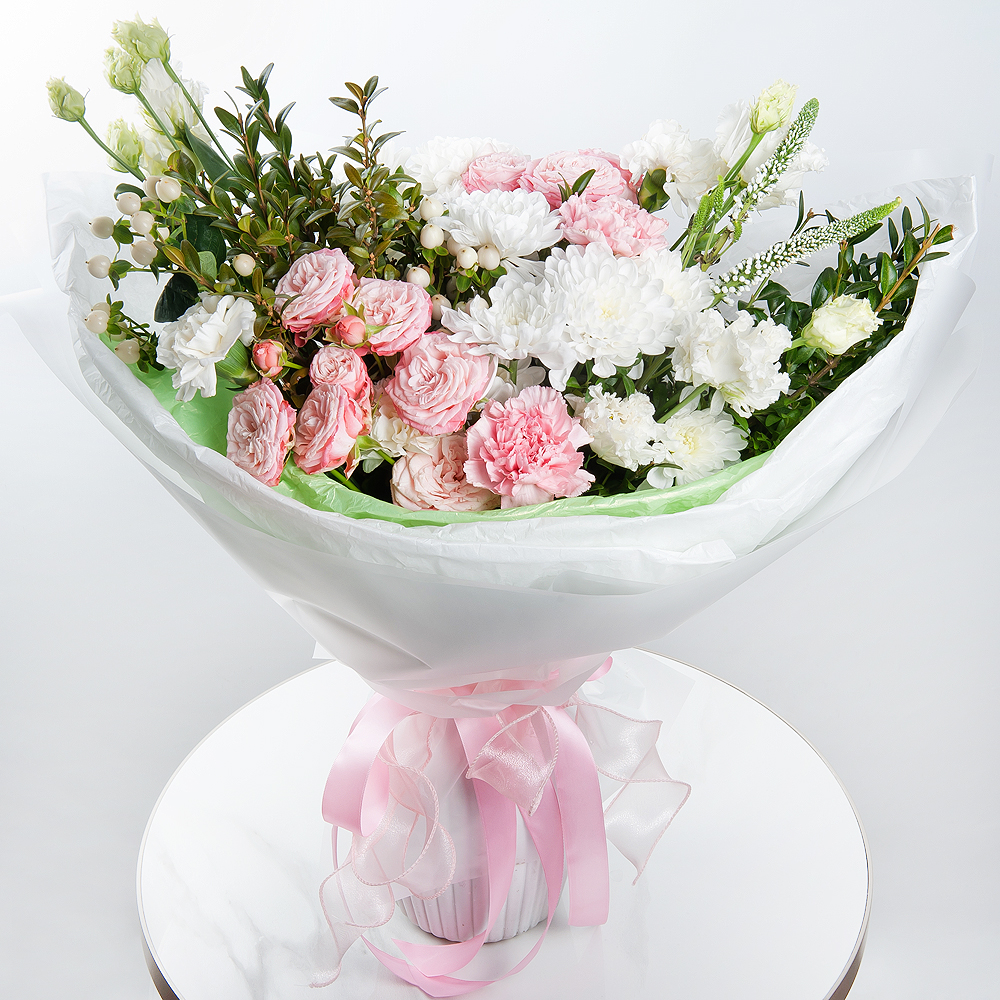Этот букет – нежность нефрита, воплощенная в цветах. Кустовые хризантемы, гвоздики, пионовидные кустовые розы, лизиантус, гиперикум, окруженные зеленью вероники и фисташки создают утонченную и элеган…