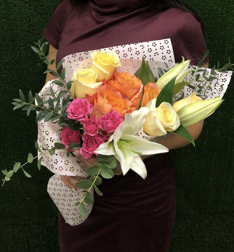 Букет в приятном цвете с лилиями и розами. Букет подойдет для подарка на праздники разной тематики: 1 сентября, день учителя, как подарок маме или бабушке.