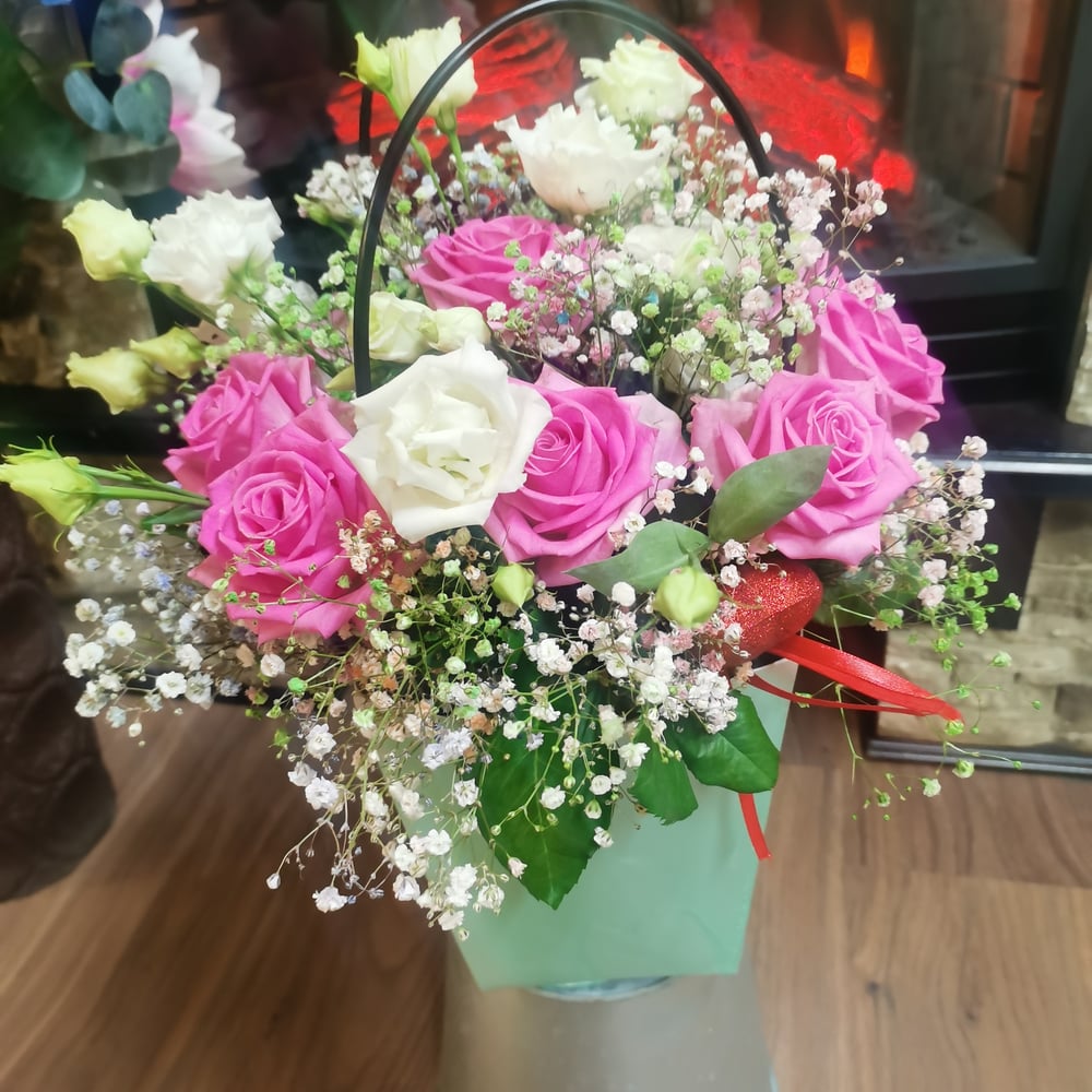 Коробка с цветами «Невесомость» из эустом и гипсофил