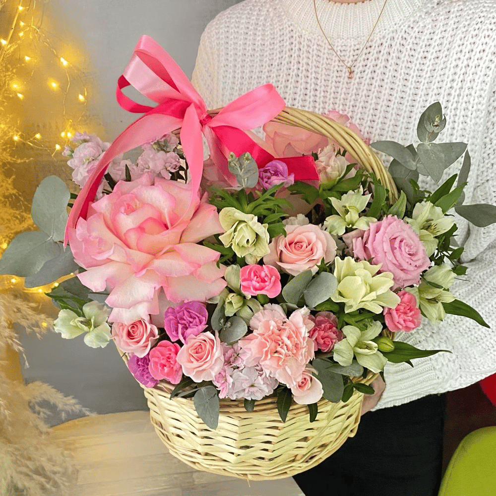 Корзина с цветами «Невесомый» из гвоздик и роз